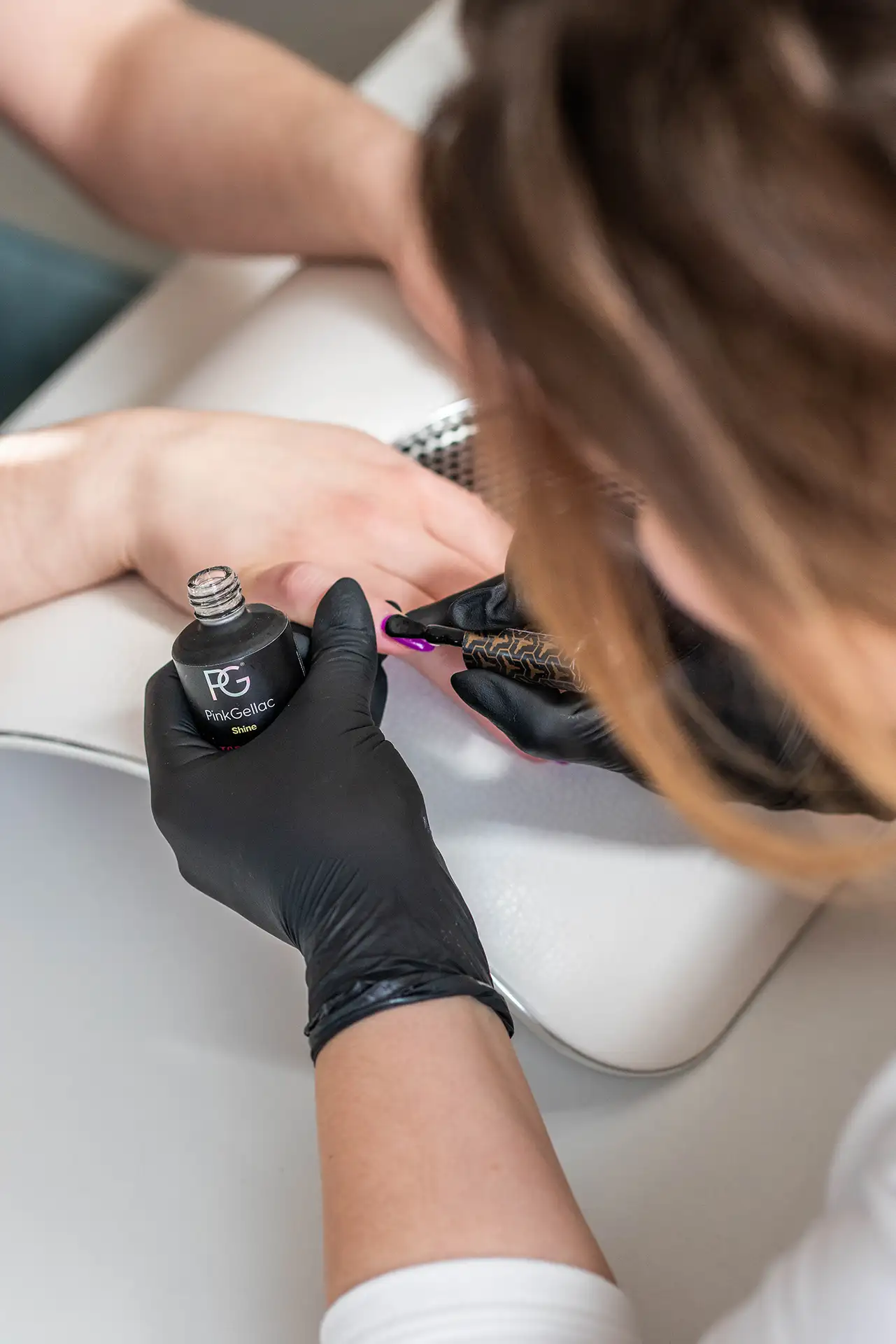 Schonende Entfernung von Shellac mit einer speziellen Lösung. Der Lack wird aufgeweicht und sanft abgetragen. Eine regelmäßige Pause zwischen den Anwendungen hilft, die Naturnägel gesund zu halten.